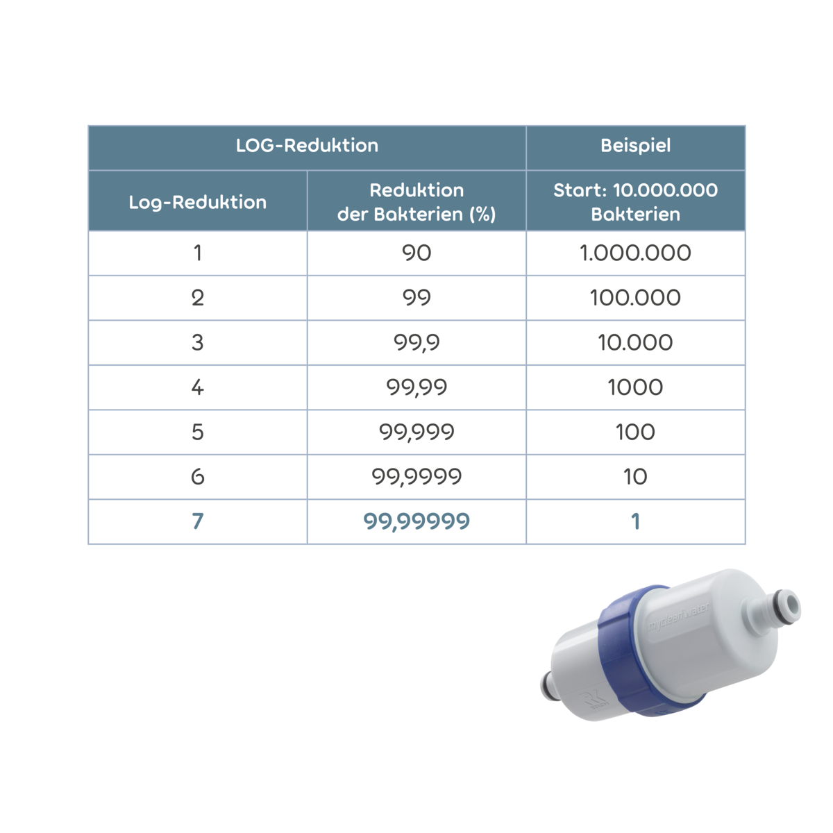 Die Reduktion der Keime wird dabei in verschiedenen Log-Stufen angegeben. Mit Zunahme der Log-Stufe nimmt die Anzahl der Erreger deutlich ab. Da wir bei REICH Water Solutions in puncto Sicherheit und Hygiene keine Kompromisse machen, reduziert myclean®water sterile die Keimlast um volle 7 Log-Stufen – und ist damit ein hochwirksamer Filter, der nach dem internationalen Standard für Sterilfiltration geprüft ist (ASTM F838-20).